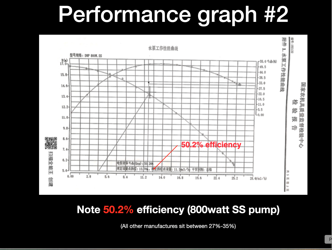 We have tested our 800 watt pump with independent test facilities in China, Germany and Australia and compared the results to one of the industry leaders. Here are the results in graphical form.